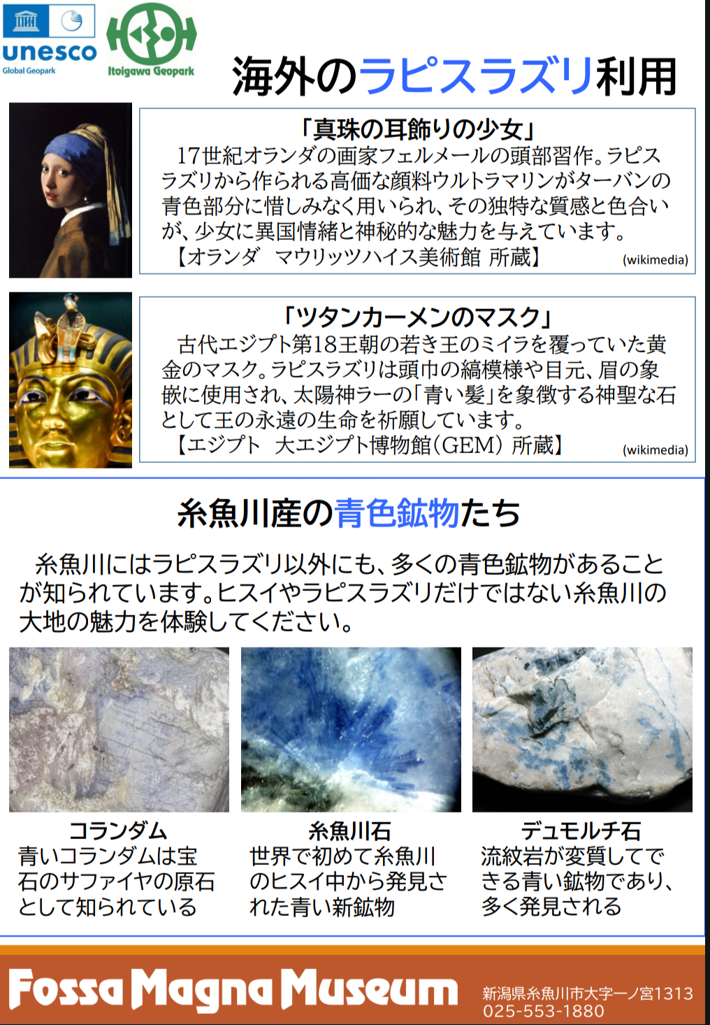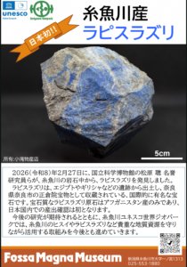 「糸魚川で発見されたラピスラズリは8月30日(日)」まで、 フォッサマグナミュージアムのふるさと展示室で展示されています 。タイムリーですね。